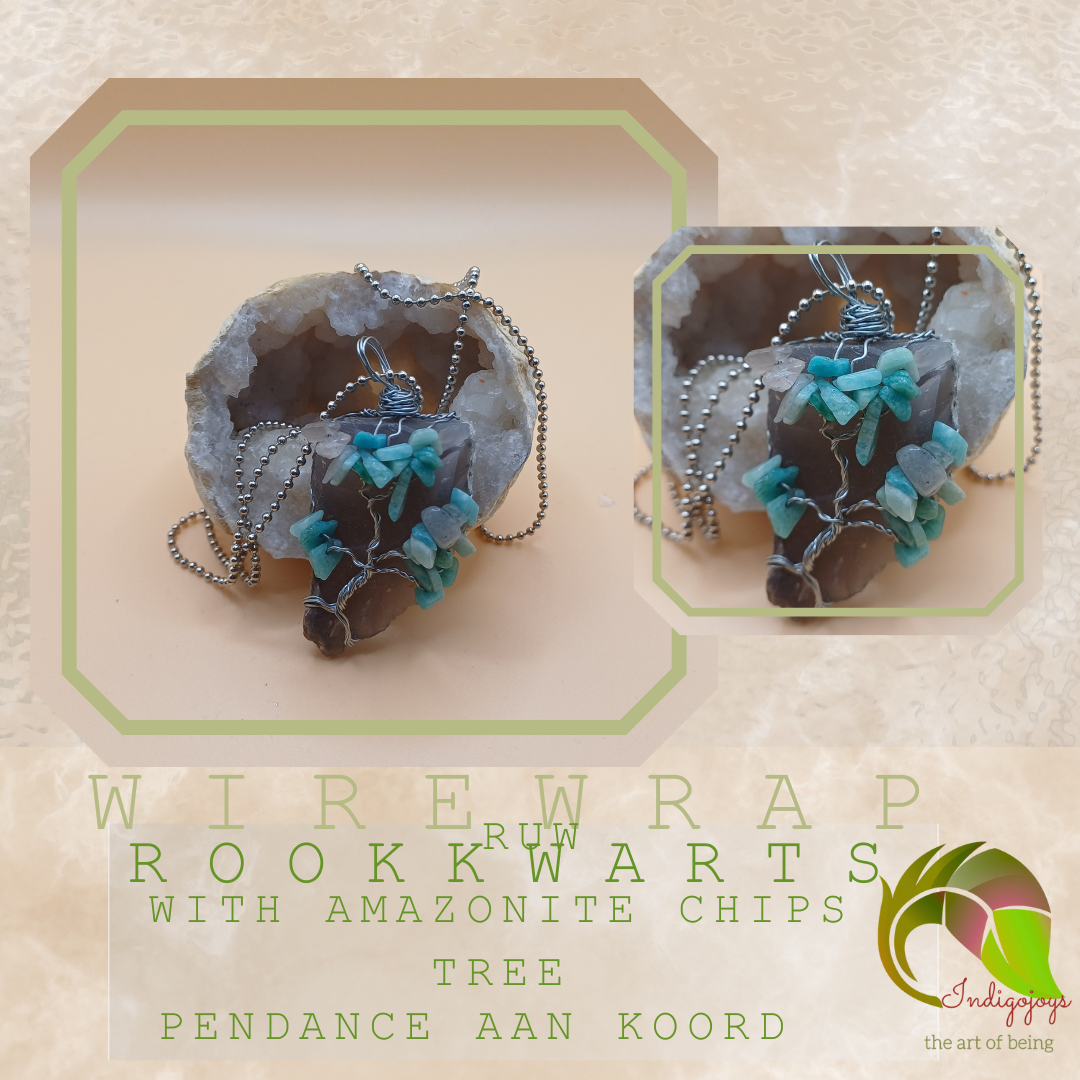 Deze met de hand gewikkelde Tree of Life hanger is opgebouwd rond een krachtige rookkwarts basis, met blaadjes van zachte amazoniet chips. Rookkwarts staat voor aarding en bescherming, terwijl amazoniet kalmeert en balans brengt. Samen vormen ze een harmonieus symbool van groei, kracht en innerlijke rust.