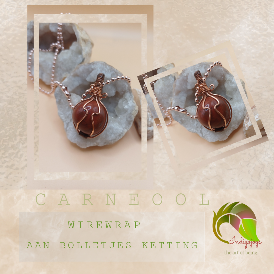 Deze handgemaakte fancy wiring hanger combineert een centrale carneool steen liefdevol gewikkeld in rose goudkleurige wire en aan bolletjes ketting . Carneool staat bekend om haar verwarmende energie: ze activeert het basischakra, versterkt zelfvertrouwen en geeft een zachte maar krachtige impuls aan creativiteit en levenslust.