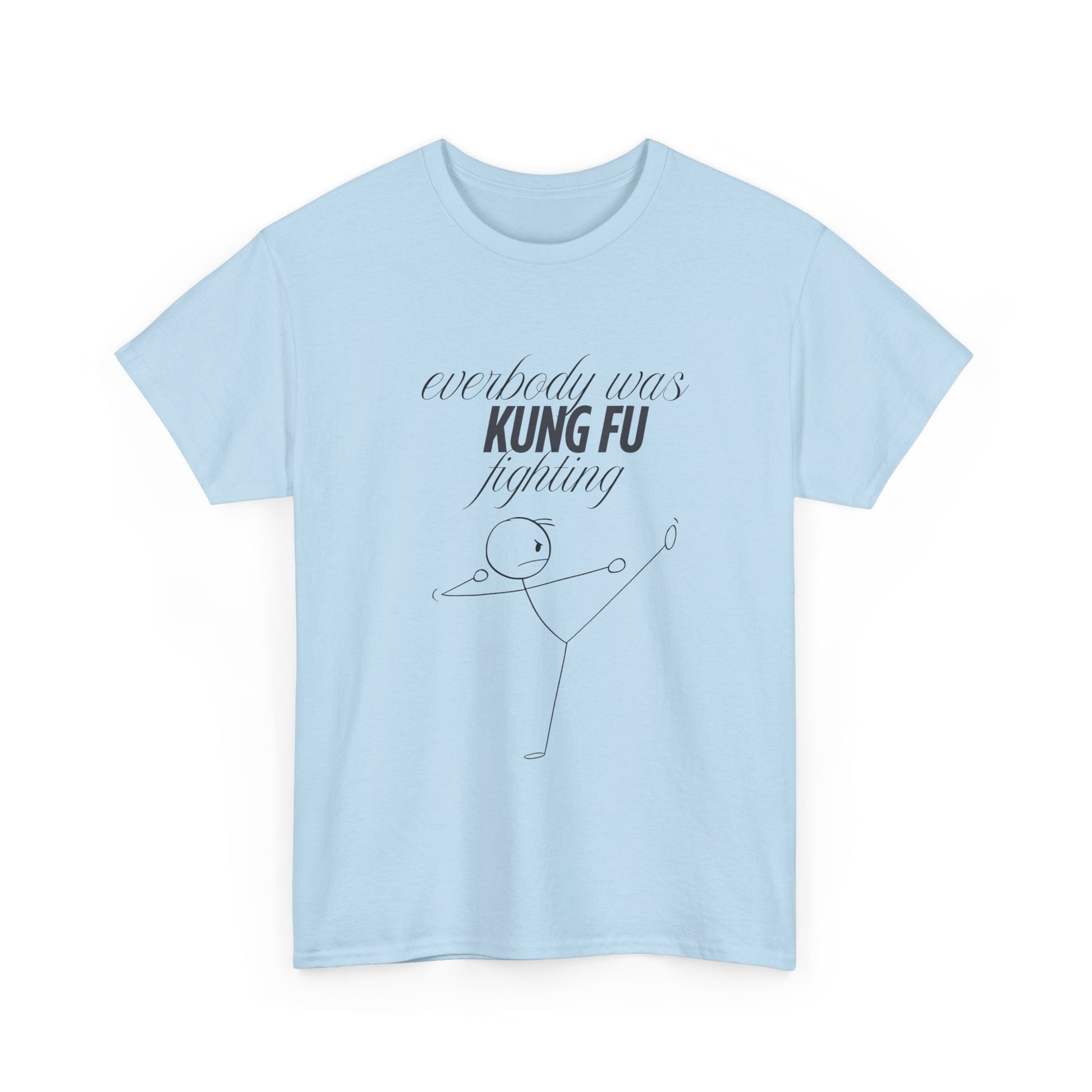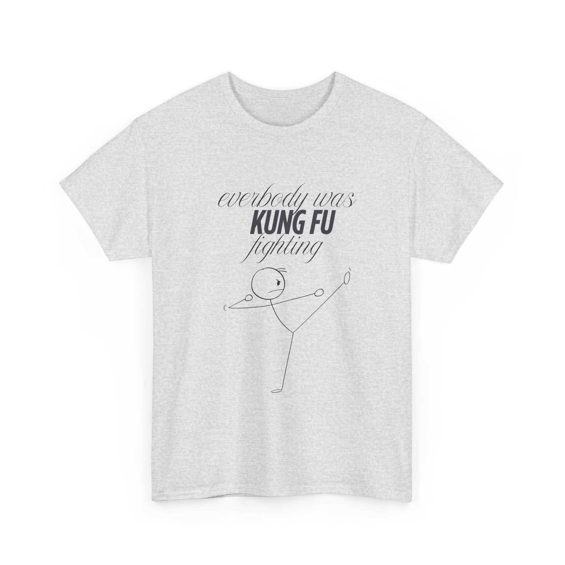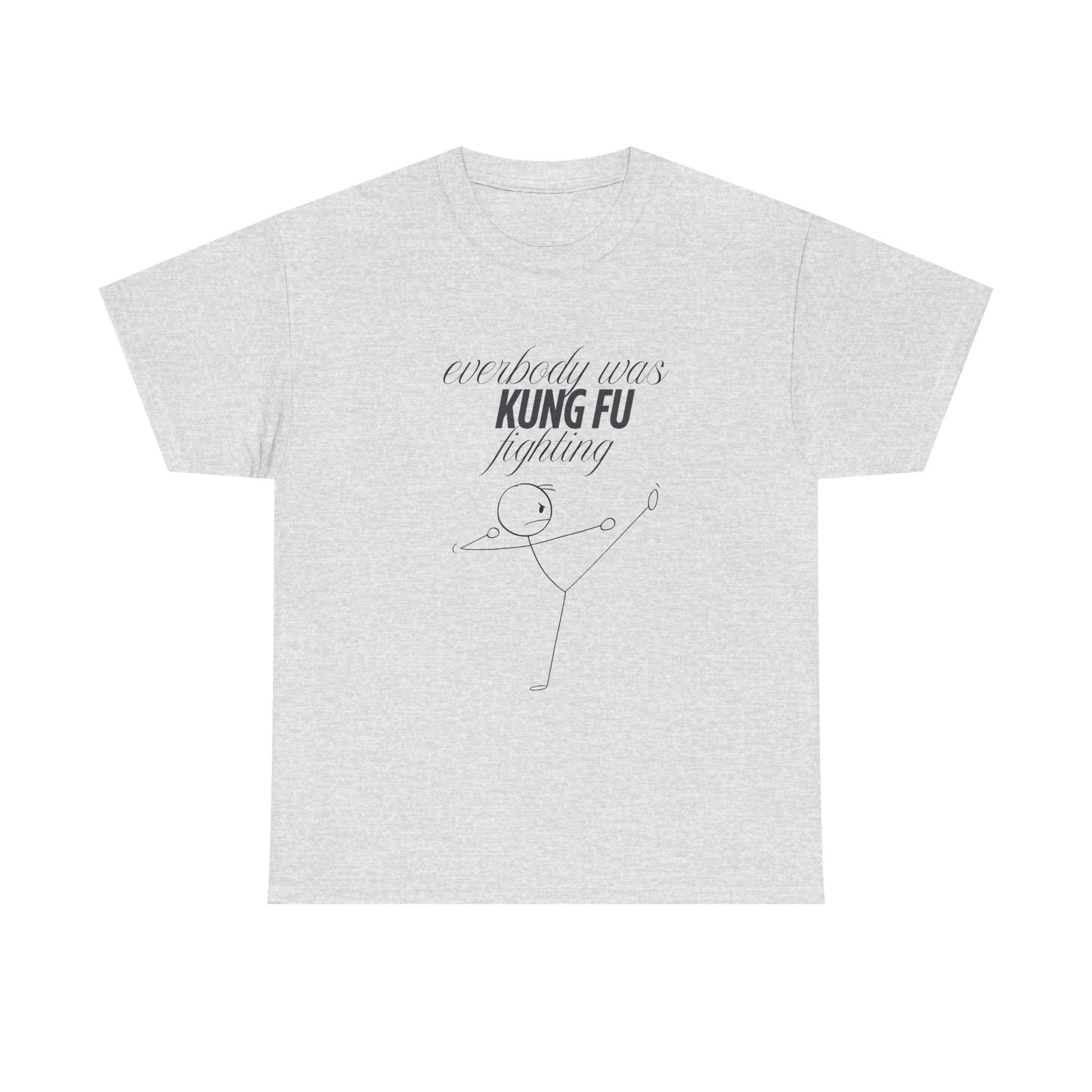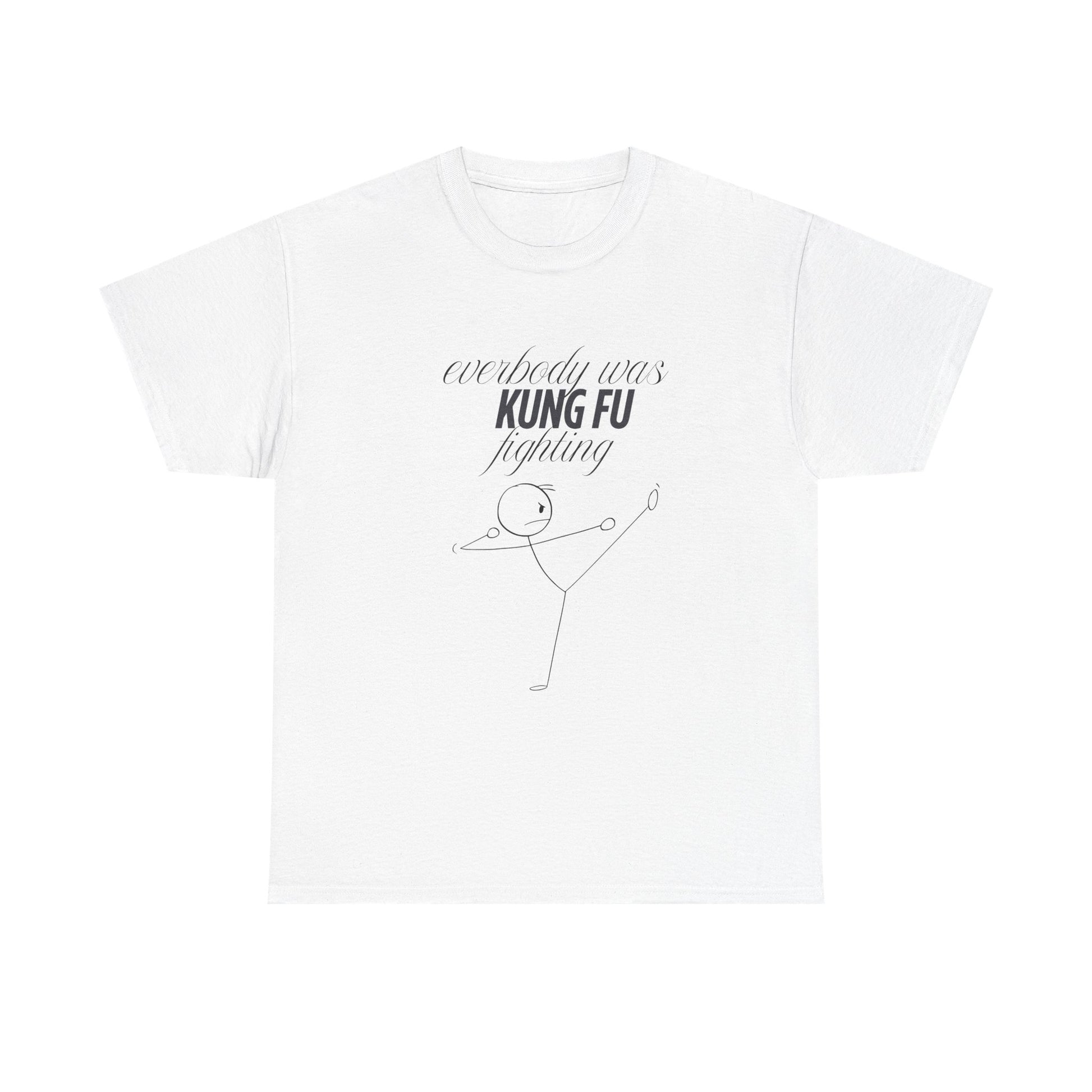 A funny and quirky T-Shirt featuring the phrase 'every body was kungfu fighting'. Perfect for those who appreciate humor and want to add a playful touch to their wardrobe. This T-Shirt is ideal for casual wear and can be a great conversation starter. Relevant for casual outings, parties, and everyday wear.