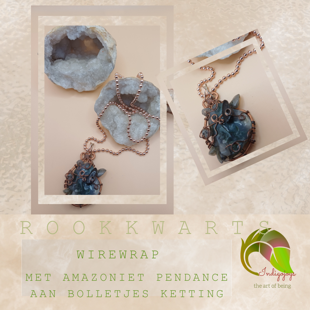 Deze opvallende hanger is een ware blikvanger, met een mystieke rookkwarts als centrumstuk, artistiek omwikkeld met koperkleurige draad in een sierlijke, gedetailleerde wire wrapping techniek. Rondom de rookkwarts zijn ruwe chips van natuurlijke amazoniet verwerkt – elk steentje zorgvuldig geplaatst voor een speels, natuurlijk effect.
