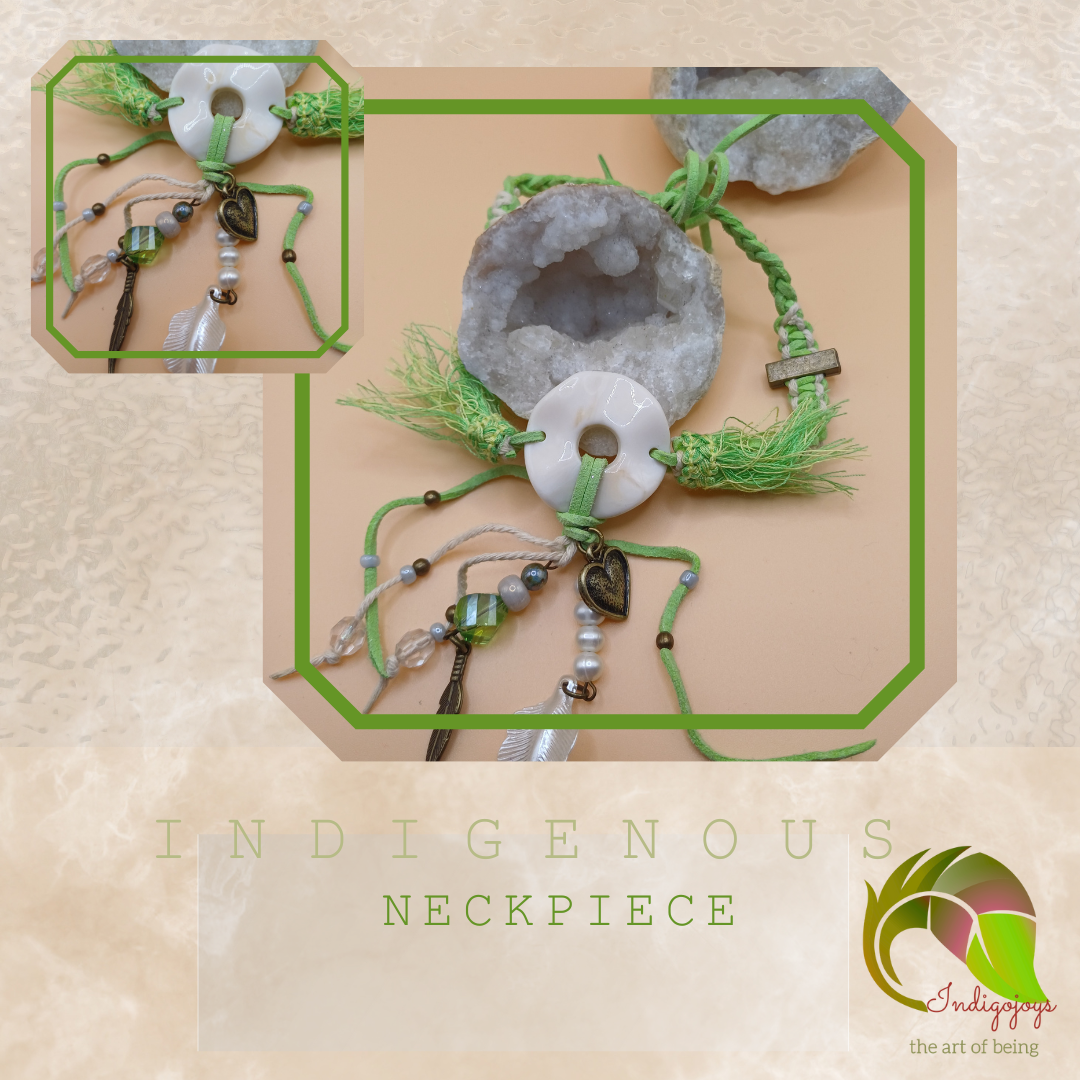 Deze opvallende limegroene choker is geïnspireerd op inheemse stijlen en met de hand gemaakt met respect voor natuur en symboliek. Versierd met speelse veren en levendige kleuren staat dit sieraad symbool voor vrijheid, verbinding met de aarde en spirituele kracht.