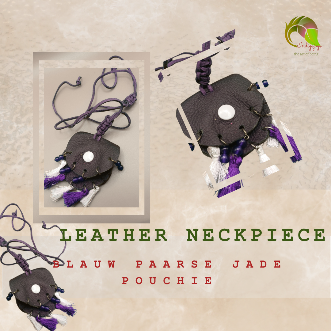 Deze handgemaakte neckpiece is een klein pouchie van paars leder, afgewerkt met een sierlijk blauwpaars jade steentje, een paars-wit kwastje en een vleugje macramé liefde.