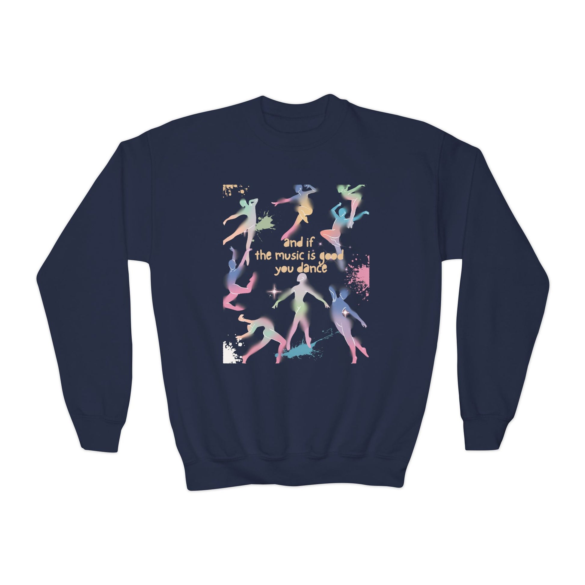 A cozy and stylish youth sweatshirt with the phrase 'if the music is good dance' printed on it. Perfect for music lovers and dancers, this sweatshirt gives off a fun and energetic vibe. Ideal for children who enjoy comfortable and trendy clothing. Great for casual wear or as a gift for birthdays, holidays, and dance performances.